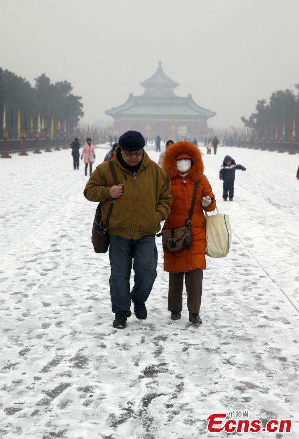 People walk on a snow-covered road in the Temple of Heaven in Beijing, January 31, 2013. Light snow hit parts of the city on Thursday and the local meteorological observatory issued a yellow alert for icy road. [Photo: CNS/Zhang Hao]