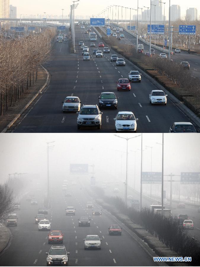 Combo photo taken on Feb. 1, 2013 (up) and Jan. 22, 2013 (bottom) shows vehicles move on a road in north China's Tianjin. A strong wind hit Tianjin on Friday, blowing away the smog that lingered in the city for days. (Xinhua/Liu Dongyue)