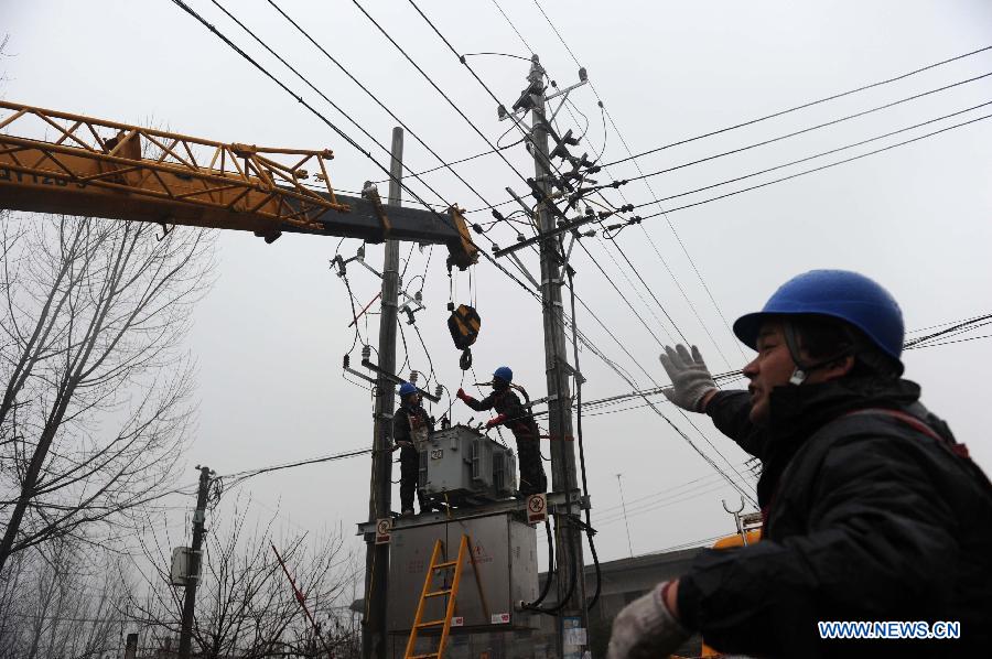 Electricians install a transformer in Xiangtang Community of Linquan County in Fuyang City of east China's Anhui Province, Jan. 31, 2013. As one of the major labor exporting place in China, Fuyang will embrace more than two millions of home-going migrant workers during the holidays of Chinese Lunar New Year. The electronic appliances brought by the returned migrant workers are going to leave huge impact to the power grid in the rural communities. Local power company began to upgrade the power cables and devices to guarantee the power supply during the upcoming Chinese Spring Festival. (Xinhua/Liu Junxi)
