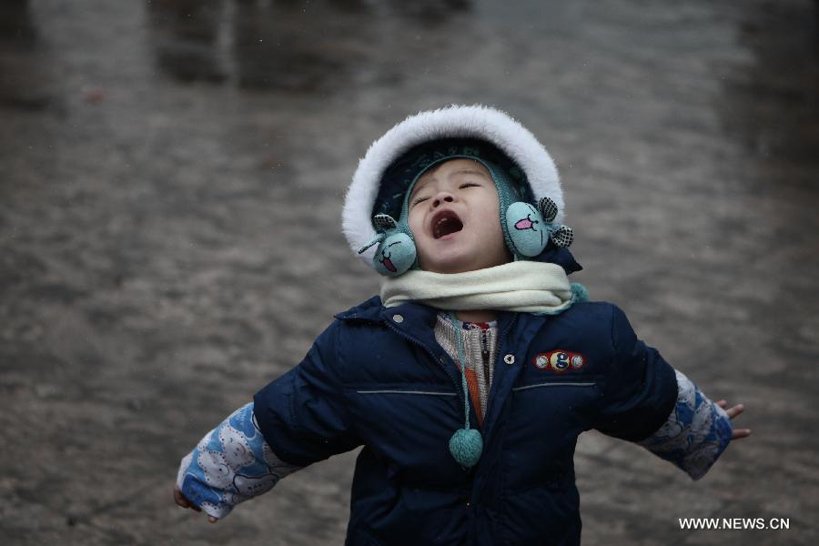 A child feels the snow with open arms at the Beijing train station in Beijing, capital of China, Feb. 3, 2013. Many children travel with their families during the 40-day Spring Festival travel rush which started on Jan. 26. The Spring Festival, which falls on Feb. 10 this year, is traditionally the most important holiday of the Chinese people.Public transportation is expected to accommodate about 3.41 billion travelers nationwide during the holiday, including 225 million railway passengers. (Xinhua/Jin Liwang)