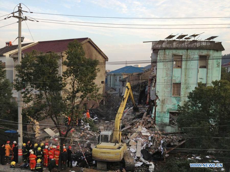 Rescuers search for victims in the debris at the accident site of a suspected boiler explosion in Cixi, east China's Zhejiang Province, Feb. 3, 2013. Two people were killed and six others injured Sunday morning when a three-story building of a flour products plant collapsed in Cixi's Shishan Village. Investigation into the exact cause of the incident is under way. (Xinhua/Liu Huiming)