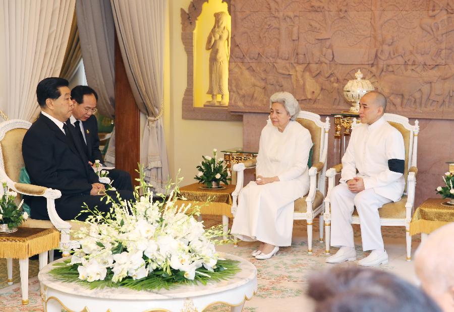 Jia Qinglin (1st L), chairman of the National Committee of the Chinese People's Political Consultative Conference, meets with Cambodia's Queen Mother Norodom Monineath Sihanouk (2nd R) and King Norodom Sihamoni (1st R) in Phnom Penh, capital of Cambodia, Feb. 4, 2013. (Xinhua/Yao Dawei)