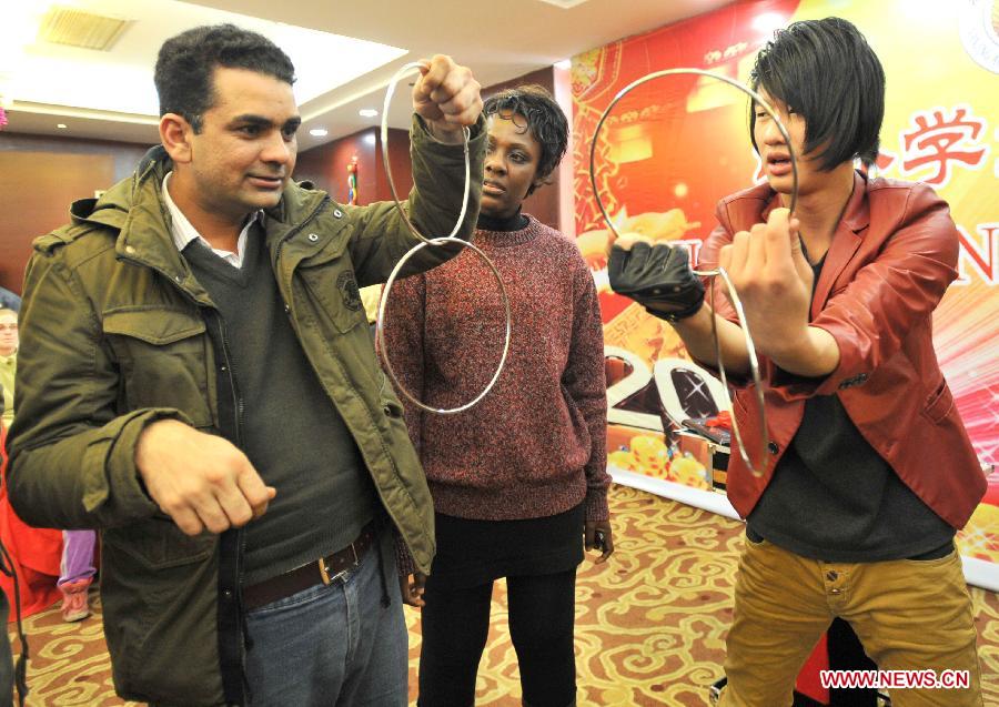 Overseas students learn tricks of magic in an activity to celebrate the Chinese New Year at the Nanjing Agricultural University in Nanjing, capital of east China's Jiangsu Province, Feb. 4, 2013. More than 50 overseas students from over 20 countries and regions experienced Chinese traditional cultural activities with local students. (Xinhua)