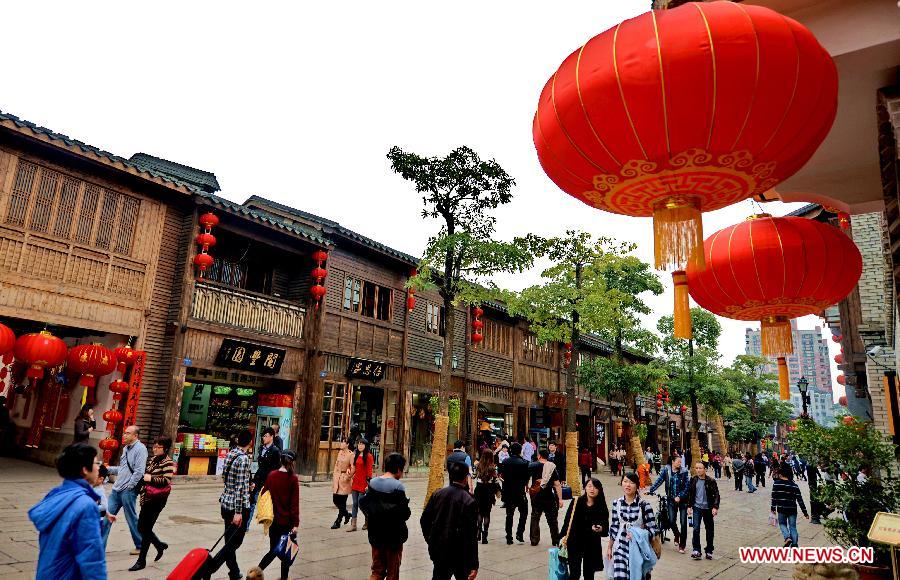 A shopping street is decorated with lanterns for the coming Spring Festival in Fuzhou, southeast China's Fujian Province, Feb. 4, 2013. (Xinhua/Zhang Guojun)
