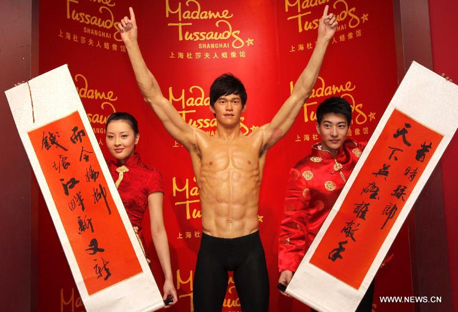 The waxwork of star swimmer Sun Yang (C) is unveiled at Madame Tussauds Shanghai in east China's Shanghai Municipality, Feb. 4, 2012. Sun is the first Chinese male swimmer to win an Olympic gold. (Xinhua/Liu Ying)