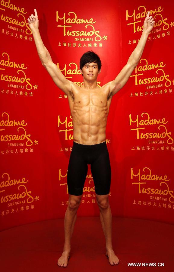 The waxwork of star swimmer Sun Yang is unveiled at Madame Tussauds Shanghai in east China's Shanghai Municipality, Feb. 4, 2012. Sun is the first Chinese male swimmer to win an Olympic gold. (Xinhua/Liu Ying)