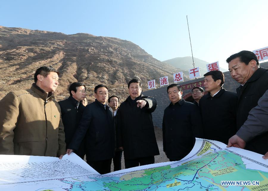 Xi Jinping (C), general secretary of the Central Committee of the Communist Party of China (CPC) and also chairman of the CPC Central Military Commission, visits a major water diversion project in the Weiyuan County of Dingxi City, northwest China's Gansu Province, Feb. 3, 2013. Xi Jinping visited villages, enterprises and urban communities, chatting with impoverished villagers and asking about their livelihood during an inspection tour to Gansu from Feb. 2 to 5. During his visit, Xi also extended Spring Festival greetings to all Chinese people as the Spring Festival, or the Chinese Lunar New Year, approaches. (Xinhua/Lan Hongguang)
