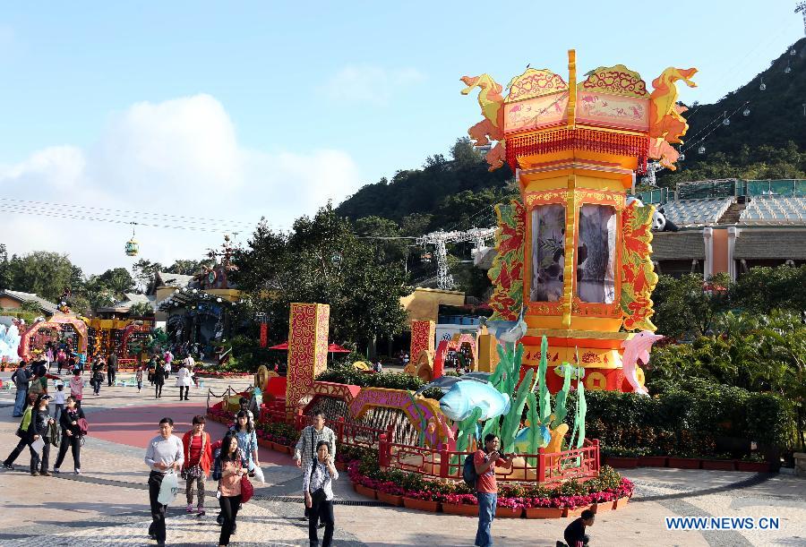 Tourists visit the newly-renovated Hong Kong Ocean Park in south China's Hong Kong, Feb. 5, 2013. The 2013 Lunar Lucky Fiesta will be held from Feb. 9 to 24 in the ocean park to celebrate the coming Chinese New Year of the Snake. (Xinhua/Li Peng)