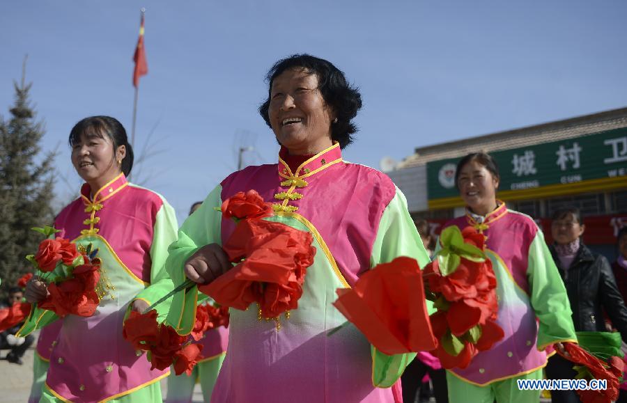 Villagers perform a folk dance to celebrate the coming Spring Festival in Haiyuan County, northwest China's Ningxia Hui Autonomous Region, Feb. 5, 2012. The Chinese Lunar New Year, or Spring Festival, falls on Feb. 10 this year. (Xinhua/Wang Peng)