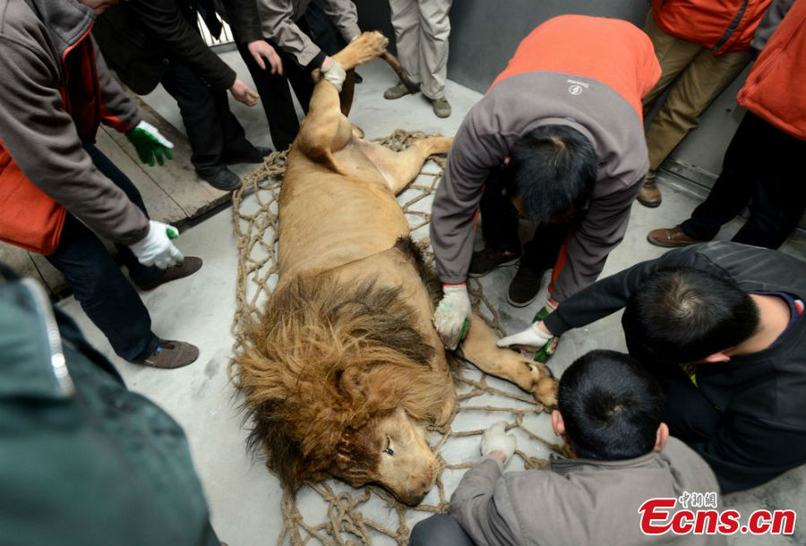 A lion is put to sleep for the move in a zoo in Chengdu, the capital of Sichuan Province, February 5, 2013. Altogether one lion and eight tigers had been moved to new dens. They will meet visitors during the Spring Festival. [Photo: CNS/Liu Jie]