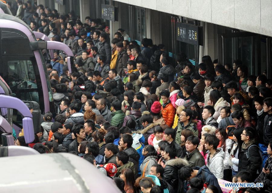 Passengers take buses in a coach hub in Zhengzhou, capital of central China's Henan Province, Feb. 6, 2013. China's transport system sees an annual travel rush around the Spring Festival, which starts on Feb. 10 this year. (Xinhua/Li Bo)