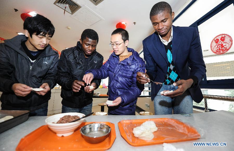 Foreign students and their Chinese peers learn to make jiaozi, or Chinese dumplings, in a celebration of the coming Spring Festival in Hangzhou, capital of east China's Zhejiang Province, Feb. 6, 2013. Over 30 foreign students and their Chinese fellows in Zhejiang University of Technology gathered on Wednesday to celebrate the Chinese Lunar New Year, or the Spring Festival, which falls on Feb. 10 this year. (Xinhua/Xu Yu)