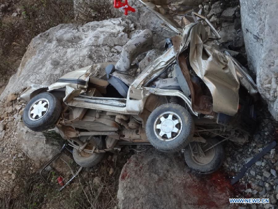 The remain of the damaged vehicle can be see at the site of road accident in Wumeng Township under an industrial and tourist development zone near Kunming, capital of Yunnan, on Feb. 6, 2013. Twelve people were killed and three others injured after a vehicle fell off a mountain cliff in Yunnan Province on Wednesday afternoon. (Xinhua)