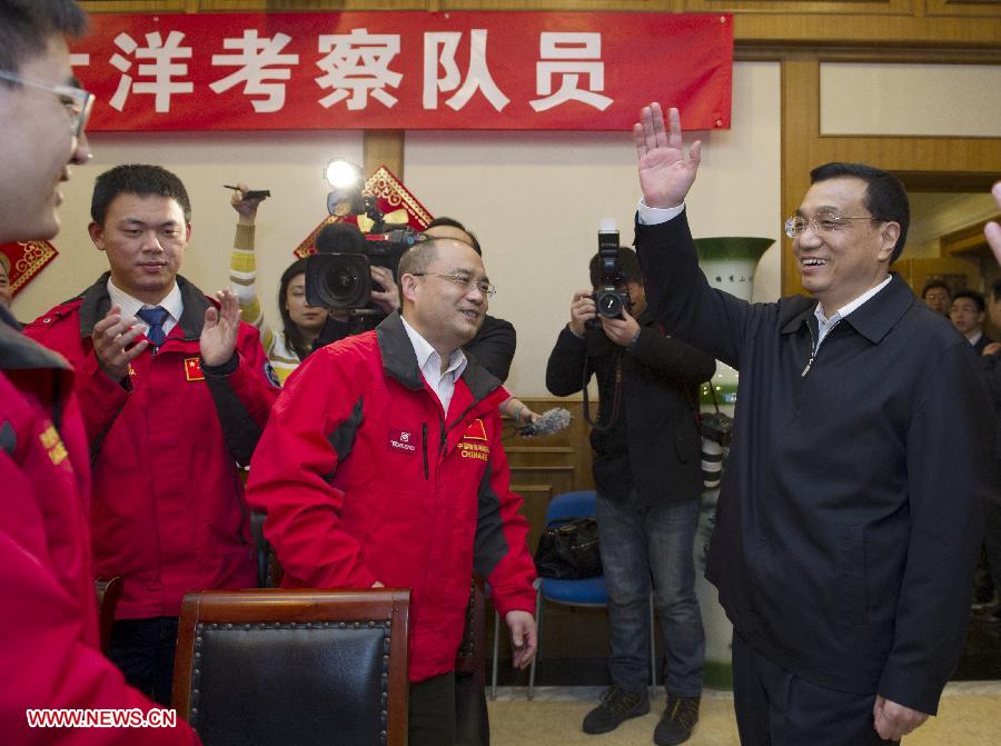 Chinese Vice Premier Li Keqiang (R, front) greets staff members of the State Oceanic Administration in Beijing, capital of China, Feb. 7, 2013. Li greeted staff of the State Oceanic Administration ahead of the Lunar New Year holiday. He also extended festival greetings via satellite video to scientists performing duties in polar regions and on the ocean, and visited representatives of scientific expeditions stationed in Beijing and their family members. (Xinhua/Wang Ye)