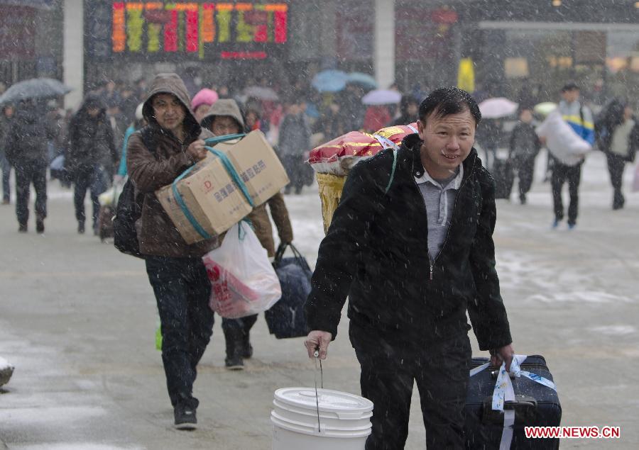 People carrying luggages head home in the snow at the Jiujiang Railway Station in Jiujiang, east China's Jiangxi Province, Feb. 8, 2013. Chinese people are rushing back home to spend the Spring Festival with family members. (Xinhua/Yan Ping)