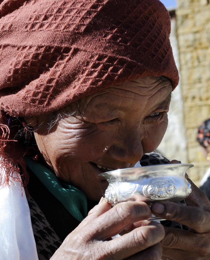 An elder drinks wine on Losar, the New Year's Day in the Tibetan calendar, at Caina Village of Qushui County in Lhasa, capital of southwest China's Tibet Autonomous Region, Feb. 11, 2013. People of the Tibetan ethnic group embraced the "Water Snake Losar", the New Year's Day in the Tibetan calendar on Feb. 11. (Xinhua/Chogo)