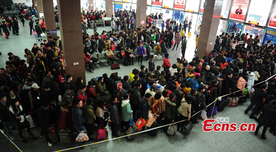 Passengers line up in a waiting room at a bus station in Meishan, Sichuan province, Feb. 15, 2013. China's transportation systems were tested on Friday, with travelers returning to work as the week-long Lunar New Year celebration draws to a close. (CNS/Liu Zhongjun)
