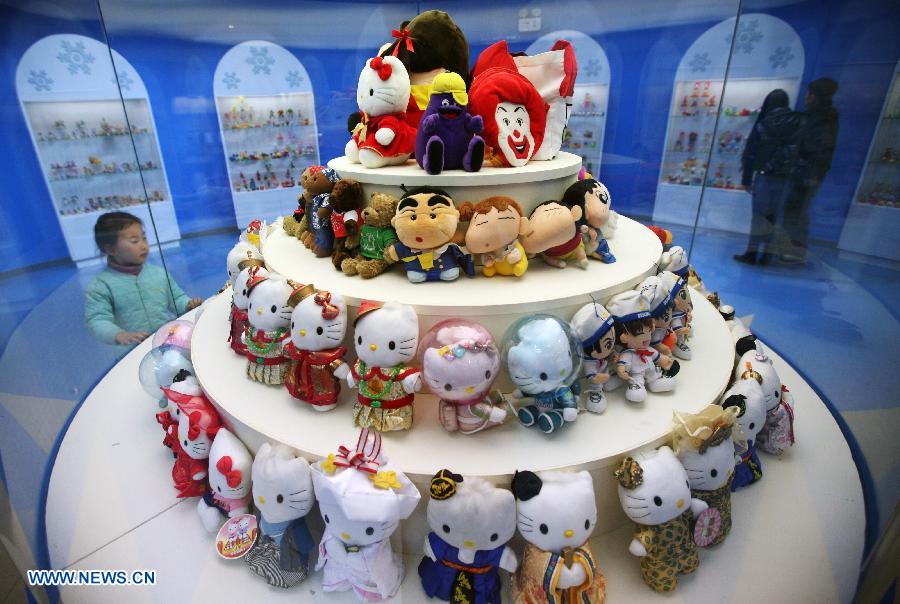 A child looks at cartoon toys at a cartoon experience center in Nanjing Science and Technology Museum in Nanjing, capital of east China's Jiangsu Province, Feb. 14, 2013. A cartoon experience center covering an area of 2700 square meters started its test operation on Thursday, offering a place for fans to know about the cartoon culture and industry. (Xinhua)