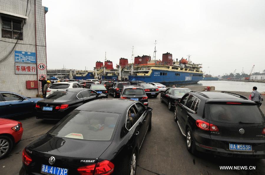 Vehicles which were detained by a heavy fog leave a port in Haikou, capital of south China's Hainan Province, Feb. 16, 2013. A total of 46,000 passengers and 8,700 vehicles have left the Port of Haikou from 8:00 p.m. Friday to 8:00 a.m. Saturday, after being detained by a heavy fog that disrupted the waterway traffic across the Qiongzhou Strait. (Xinhua/Wei Hua)