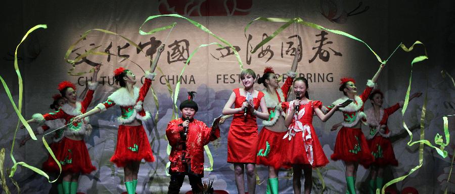 Dancers perform during a show by China's "Cultures of China, Festival of Spring" art group in Paris, capital of France, Feb. 16, 2013. (Xinhua/Gao Jing)