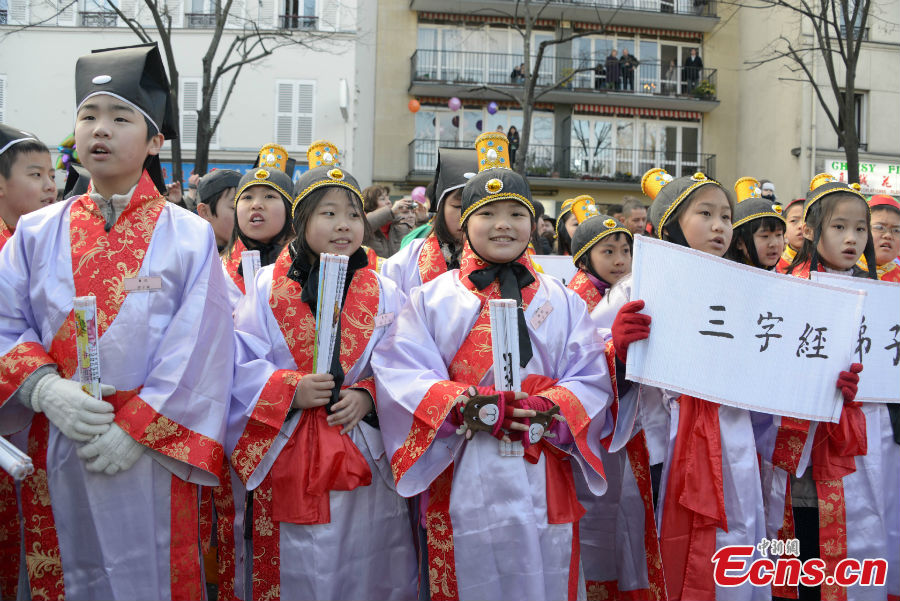 Children in costumes of ancient China participate in a parade to celebrate the traditional Chinese Lunar New Year in Paris, France, February 17, 2013. [Photo: CNS/Long Jianwu]