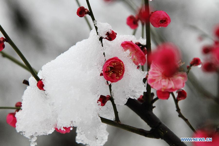 Photo taken on Feb. 19, 2013 shows snow-covered red plum buds in Nantong, east China's Jiangsu Province, Feb. 19, 2013. Many cities in eastern and central China received snowfall on Feb. 19. (Xinhua/Xu Congjun)