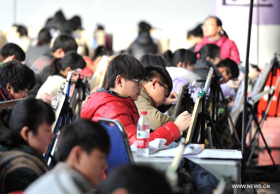 Candidates of Shandong University of Art and Desgin sit for painting examination at Jinan Shungeng International Exhibition Center in Jinan, capital of east China's Shandong Province, Feb. 20, 2013. More than 100,000 students applied for the entrance examination of China's art colleges in Shandong Province this year, up about 10 percent as compared to the number of last year. (Xinhua/Xu Suhui)