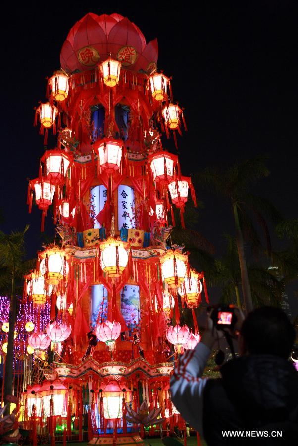 A citizen walks in front of a lantern creation in Hong Kong, south China, Feb. 21, 2013. As China's Lantern Festival falls on Feb. 24 this year, the square outside the Hong Kong Cultural Center were decorated with various lights, which attracted citizens and tourists. (Xinhua/Jin Yi)