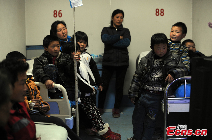 A stampede accident took place at 6:15 a.m. on February 27 in Xueji County of Xiangyang, Central China's Hubei Province. After the incident, 11 students were rushed to a local hospital, where four of them were confirmed to be deceased. The stampede accident was attributed to dereliction of duty and eight officials have been removed from their posts, according to the city government. Photo shows injured students at the local hospital. [Photo: CNS / Zhang Chang]
