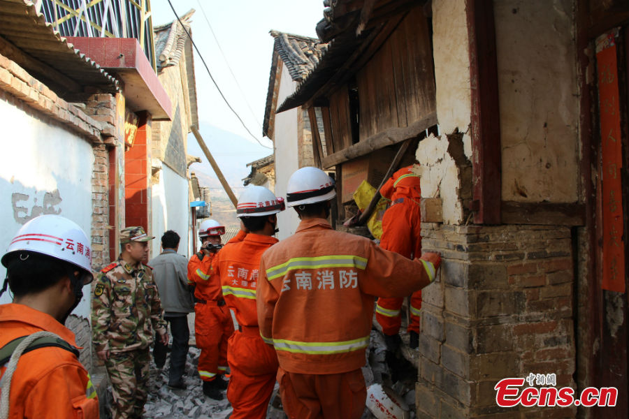 Rescue work is underway in quake-hit areas in Eryuan County, Dali Bai Autonomous Prefecture, Southwest China's Yunnan Province, March 3, 2013. A 5.5-magnitude earthquake hit several villages in the county on Sunday afternoon, injuring 30 people. [Photo: CNS/Li Peirong]