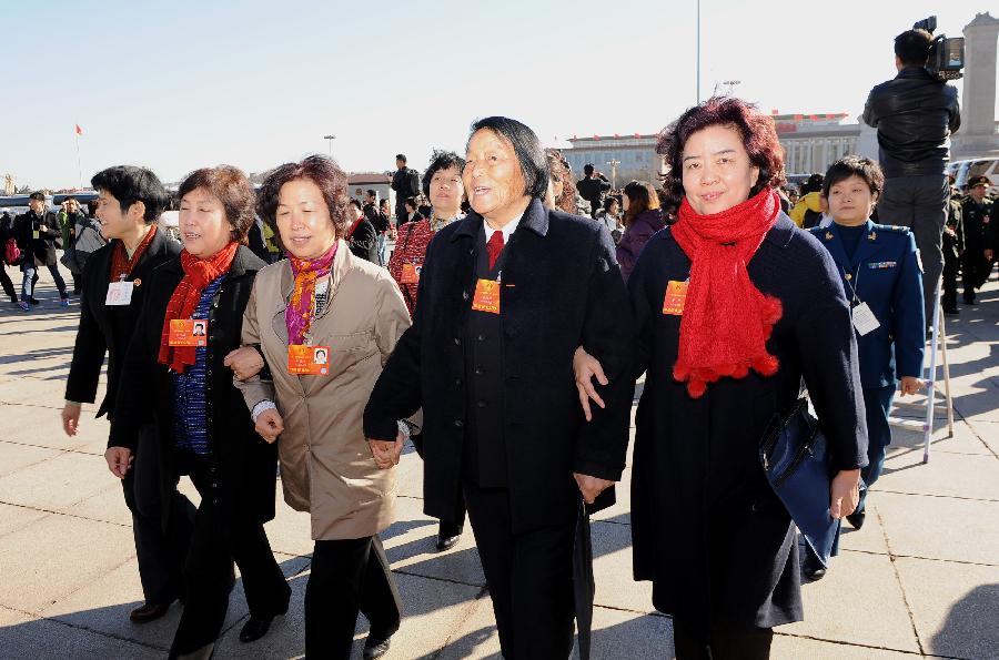 Shen Jilan (2nd R front), a deputy to the 12th National People's Congress (NPC), arrives at the Tian'anmen Square, along with other deputies, in Beijing, capital of China, March 4, 2013. The preparatory meeting for the first session of the 12th NPC was held in Beijing on March 4. (Xinhua/Yang Zongyou)