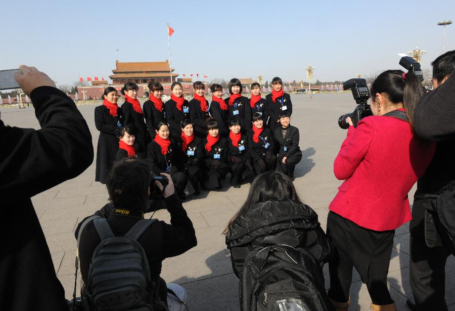 Staff members pose for a group photo at the Tian'anmen Square in Beijing, capital of China, March 3, 2013. The first session of the 12th National Committee of the Chinese People's Political Consultative Conference (CPPCC) opened in Beijing on March 3. (Xinhua/He Junchang)