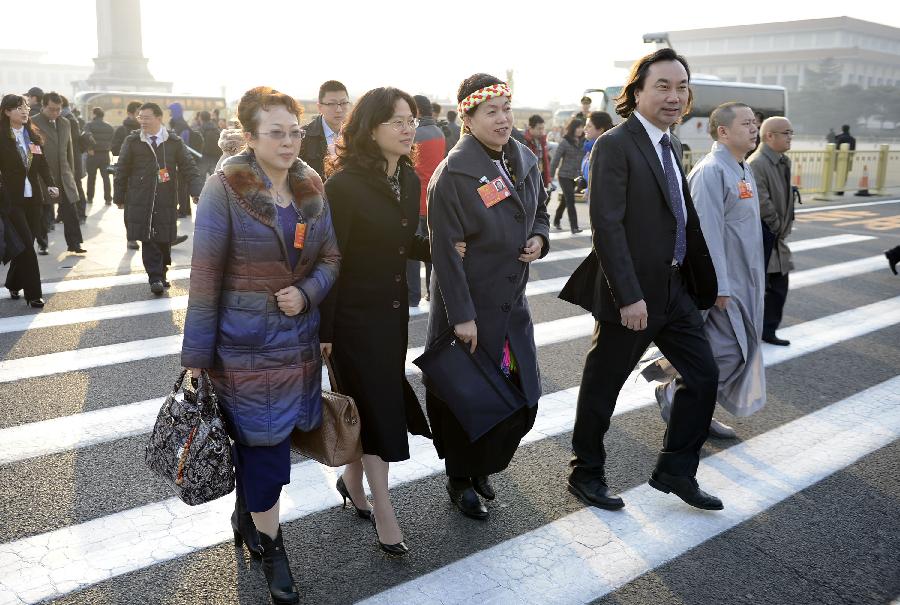 Deputies to the first session of the 12th National People's Congress (NPC) arrive at Tian'anmen Square in Beijing, capital of China, March 5, 2013. The first session of the 12th National People's Congress (NPC) will open at the Great Hall of the People in Beijing on March 5. (Xinhua/Wang Peng)