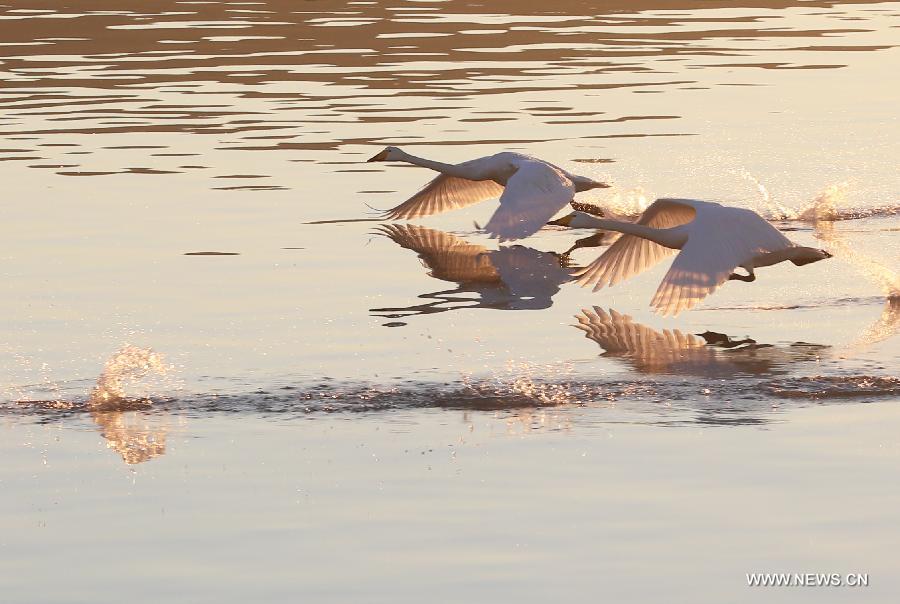 Whooper swans fly over a swan nature reserve in Rongcheng City, east China's Shandong Province, March 5, 2013. With the temperature rising, swans have begun leaving Rongcheng where they spent the winter.(Xinhua/Wang Fudong)