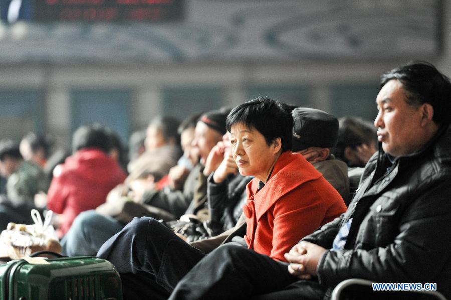 Passengers are seen at a waiting hall at the railway station in Harbin, capital of northeast China's Heilongjiang Province, March 6, 2013. The 40-day Spring Festival travel rush, started on Jan. 26 this year, came to the last day on Wednesday. The Spring Festival, which falls on Feb. 10 this year, is traditionally the most important holiday of the Chinese people. It is a custom for families to reunite in the holiday, a factor that has led to massive seasonal travel rushes in recent years as more Chinese leave their hometowns to seek work elsewhere. (Xinhua/Wang Song)