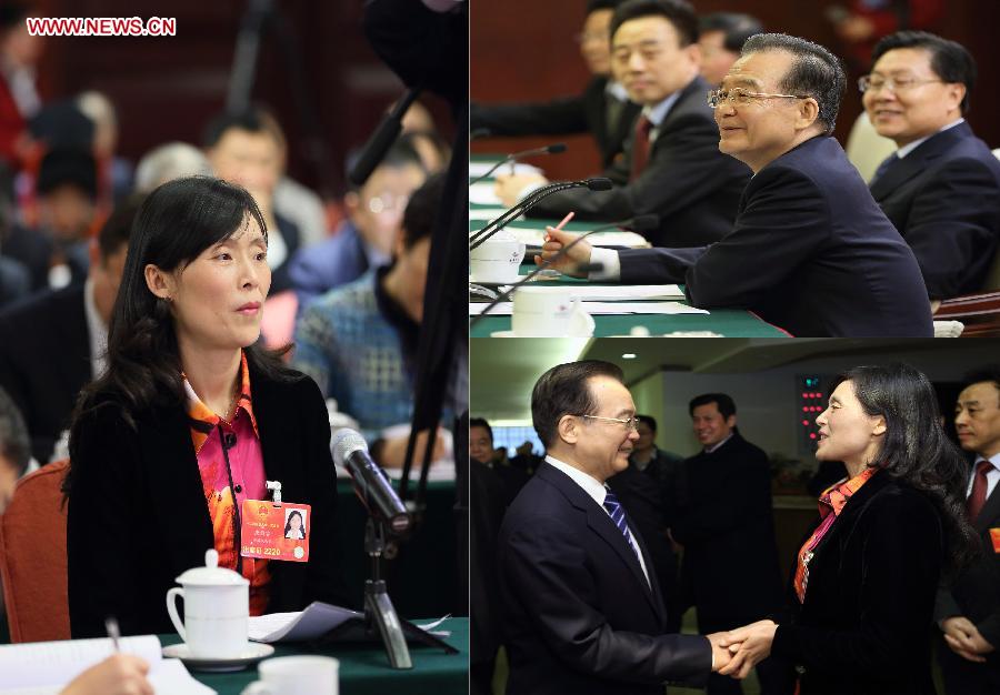This combined photo shows Chinese Premier Wen Jiabao shakes hands with Tang Qunrong, a deputy to the 12th National People's Congress (NPC), after joining a discussion with deputies from southwest China's Sichuan Province, in Beijing, capital of China, March 6, 2013. By the end of her presentation during the discussion, Tang, also an official of a grassroots organization of the Communist Party of China (CPC) in Sichuan, told the premier that the residents from the community she serves wished she could have a chance to shake hands with him. Wen positively responded her. (Xinhua/Lan Hongguang)