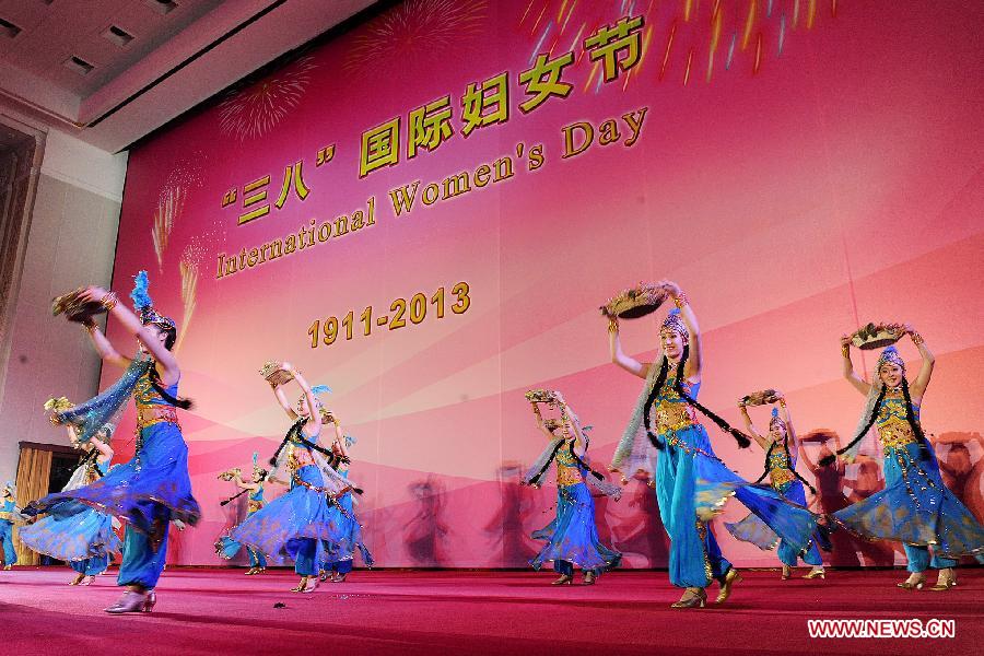 Dancers perform during a reception celebrating the upcoming International Women's Day in Beijing, capital of China, March 6, 2013. Chinese and foreign female representatives attended an All-China Women's Federation (ACWF) reception at the Great Hall of People on Wednesday to celebrate the upcoming International Women's Day. (Xinhua/He Junchang)