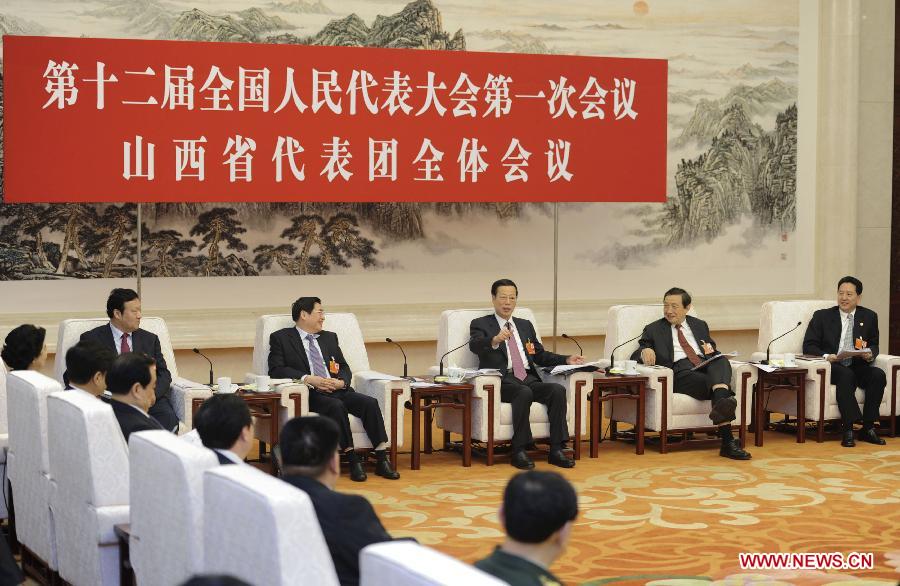 Zhang Gaoli (3rd R), a member of the Standing Committee of the Political Bureau of the Communist Party of China (CPC) Central Committee, joins a discussion with deputies to the 12th National People's Congress (NPC) from north China's Shanxi Province, who attend the first session of the 12th NPC, in Beijing, capital of China, March 8, 2013. (Xinhua/Xie Huanchi)