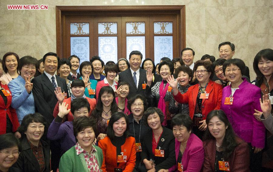 Xi Jinping (C), general secretary of the Central Committee of the Communist Party of China (CPC), poses for a group photo with female deputies to the 12th National People's Congress (NPC) in Beijing, capital of China, March 8, 2013. Xi joined a discussion with deputies to the 12th NPC from east China's Jiangsu Province, who attend the first session of the 12th NPC, in Beijing on Friday and expressed greetings, on behalf the CPC Central Committee, to the female NPC deputies and members of the 12th National Committee of the Chinese People's Political Consultative Conference (CPPCC) as well as all women in China for the International Women's Day. (Xinhua/Lan Hongguang)