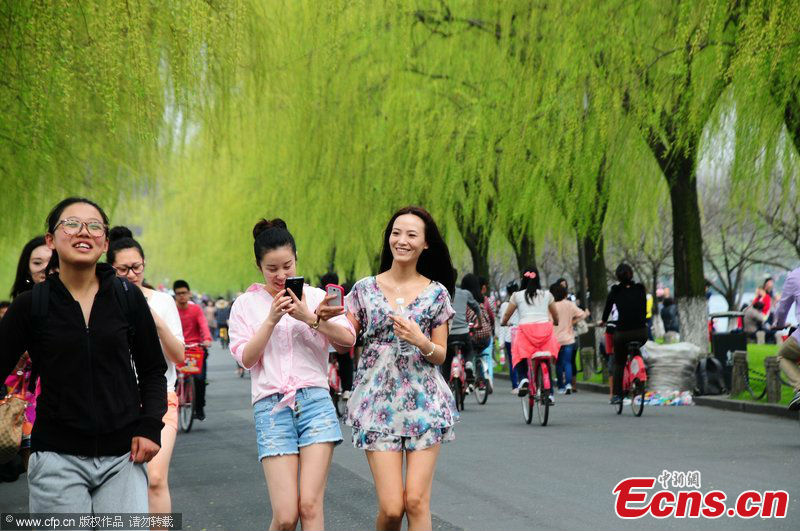 People in shorts and dresses are seen in a scenic spot in Hangzhou, the capital of Zhejiang Province, March 9, 2013. Local temperature rose to 29.9 degrees Celsius on Saturday. [Photo: CFP]
