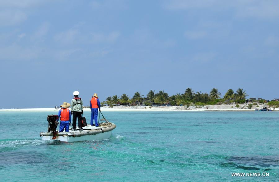 Staff members of China Marine Surveillance (CMS) head for Zhaoshu Island in Sansha City, south China's Hainan Province, March 10, 2013. A CMS detachment on Sunday started a joint ship-helicopter patrol of the Xisha Islands in the South China Sea. (Xinhua/Wei Hua)