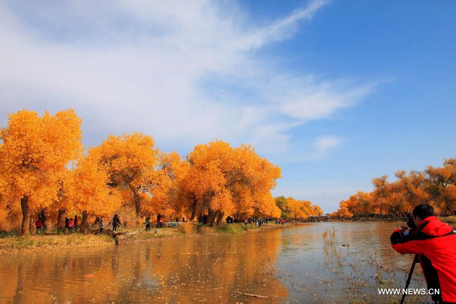 Photo taken on Oct. 3, 2012 shows a visitor takes pictures of populus euphratica forest in Ejina Banner, north China's Inner Mongolia Autonomous Region. China's Arbor Day, or Planting Trees Day, which falls on March 12 each year, is an annual compaign to encourage citizens to plant and care for trees. (Xinhua/Zhao Junchao)