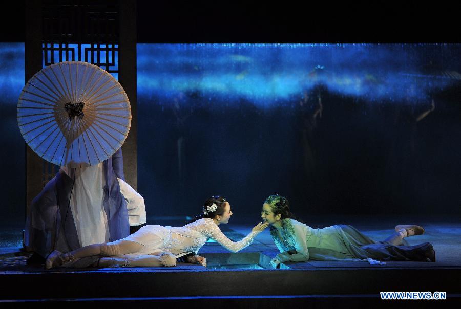Photo taken on March 10, 2013 shows the rehearsal of a modern drama"Green Snake" in Beijing, capital of China. The modern drama, directed by Tian Qinxin, will be on shown on April 10 this year. (Xinhua/Li Yan)