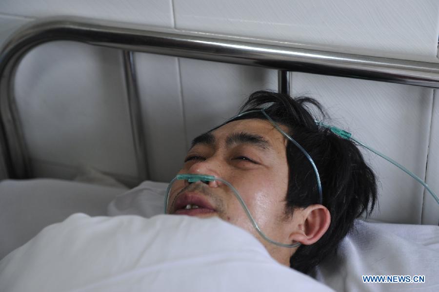 A miner injured in a coal and gas outburst accident receives medical treatment in a hospital in Liupanshui City, southwest China's Guizhou Province, March 13, 2013. Twenty-one miners were killed and four others were missing in the accident which happened Tuesday evening at the Machang Coal Mine belonging to Gemudi Company of Guizhou Water and Mining Group, in Shuicheng County of Liupanshui City. All the 20 injured miners were under stable condition, according to local authorities. (Xinhua/Ou Dongqu)