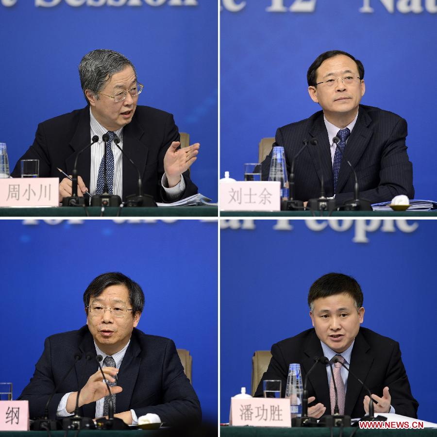 This combined photo shows Zhou Xiaochuan (L top), governor of the People's Bank of China (PBOC), the central bank, and deputy governors of the PBOC Liu Shiyu (R top), Yi Gang (L bottom) and Pan Gongsheng (R bottom) attend a news conference on China's currency policy and financial reform held by the first session of the 12th National People's Congress (NPC) in Beijing, capital of China, March 13, 2013. (Xinhua/Wang Peng)
