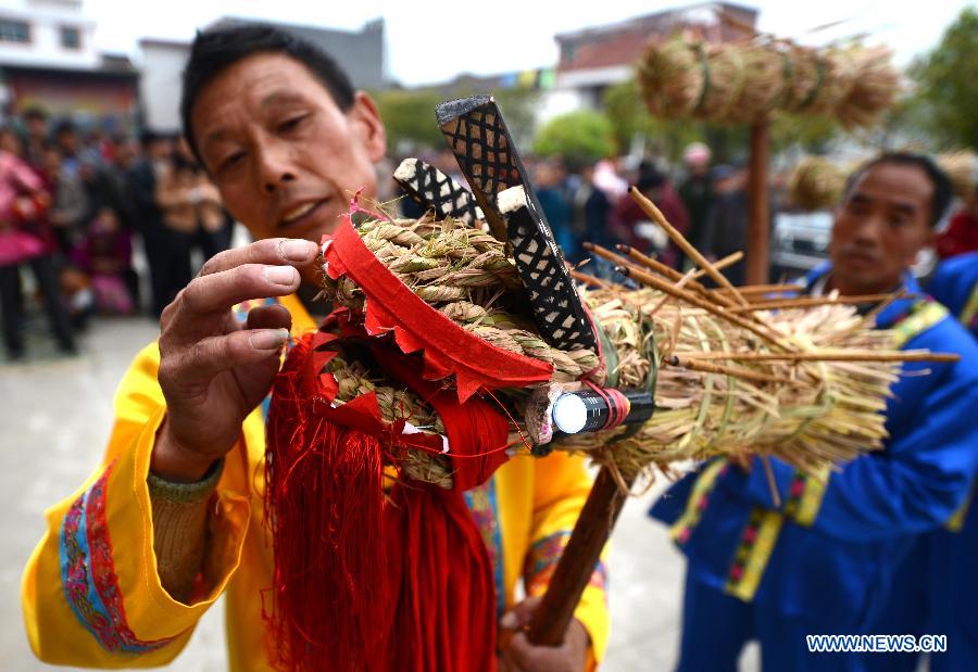 People from She ethnic group play grass dragon dance during a temple fair for the celebration of "Er Yue Er" in Donggu Shezu Township of Qingyuan District in Xiji City, east China's Jiangxi Province, March 13, 2013, on the occasion of the second day of the second lunar month, known in Chinese as Er Yue Er, "a time for the dragon to raise its head", as a Chinese saying goes. Local residents celebrated the festival with traditional performance to pray for a good harvest in the coming year. (Xinhua/Zhou Ke)