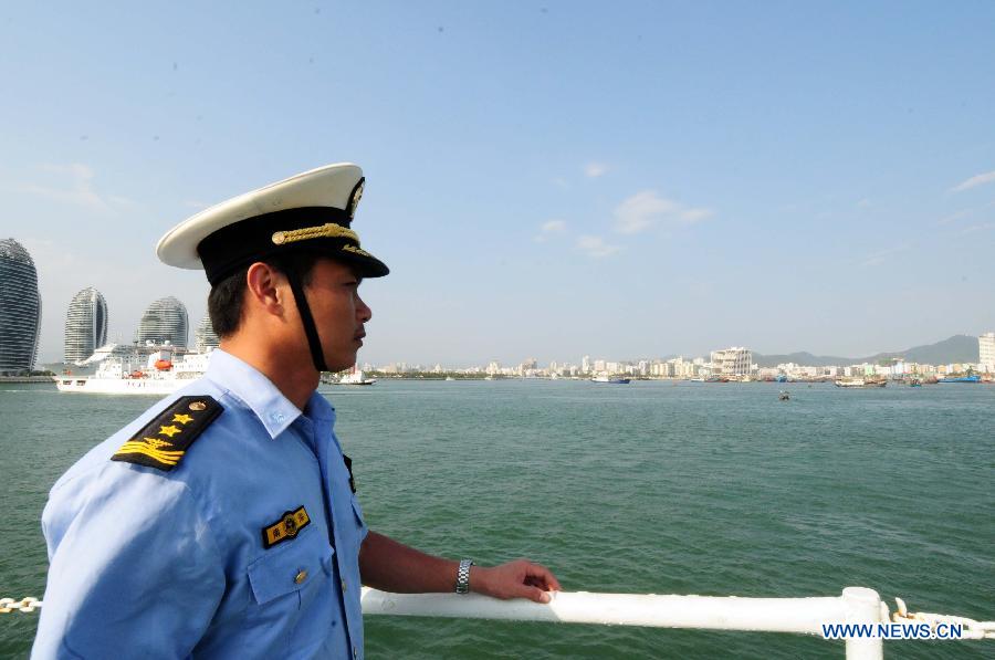 The commander of the Haijian 263 ship of China Marine Surveillance (CMS) detachement observes at the bow before the ship anchors the Sanya Harbor of south China's Hainan Province, March 14, 2013. The CMS detachment finished its patrol of the Xisha Islands in the South China Sea and was back to Sanya on Thursday afternoon. (Xinhua/Wei Hua)