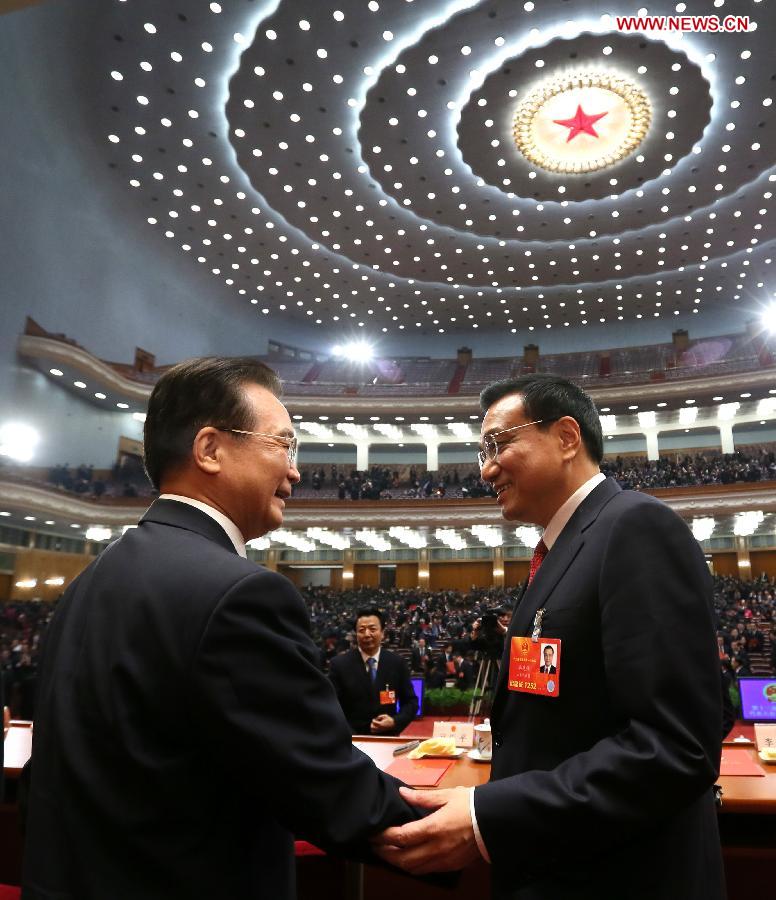 Wen Jiabao (L) shakes hands with Li Keqiang at the fifth plenary meeting of the first session of the 12th National People's Congress (NPC) at the Great Hall of the People in Beijing, capital of China, March 15, 2013. Li Keqiang was endorsed as the premier of China's State Council at the meeting here on Friday. (Xinhua/Lan Hongguang)