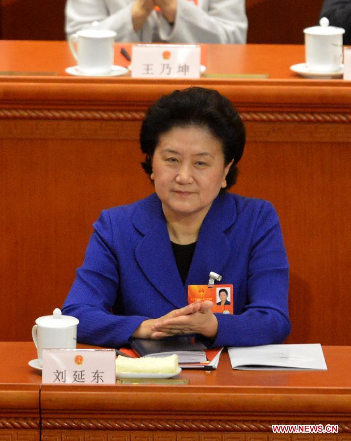 Liu Yandong attends the sixth plenary meeting of the first session of the 12th National People's Congress (NPC) in Beijing, capital of China, March 16, 2013. Zhang Gaoli, Liu Yandong, Wang Yang and Ma Kai were endorsed as vice premiers of China's State Council at the meeting here on Saturday. (Xinhua/Wang Song)