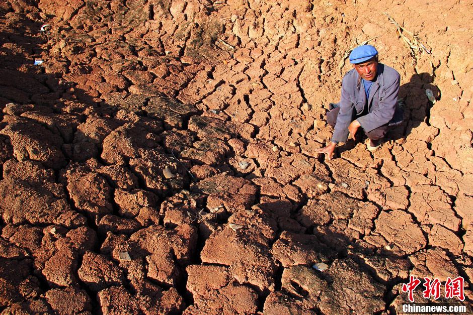 A pond dries up in Shuitang Village, Dougu County, Weining Township, Southwest China's Guizhou Province, March 16, 2013. The dry weather and high temperature in Guizhou has affected 417,800 people, 131,700 livestock and 68,000 hectares of crops. [Photo: CNS/He Huan]
